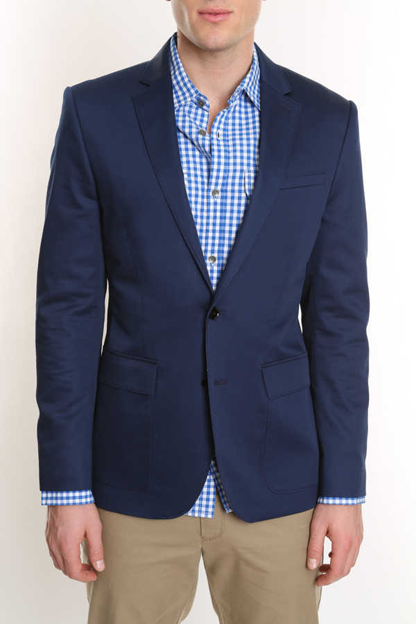 Two button, single vented, notched lapels. Slim cut through the shoulders chest and waist. Flap pockets, welt inside chest pockets. Cotton/lycra. Dry clean.