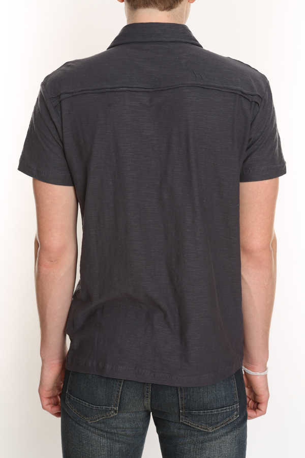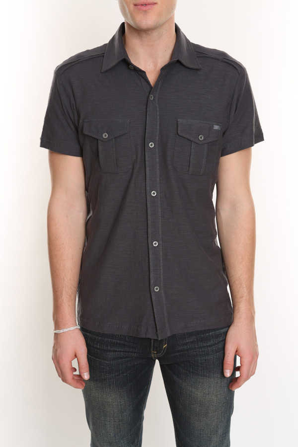 Slim fit. Two chest pockets. Silver grommet detail. Grinding and nicking at hems. 100% cotton.